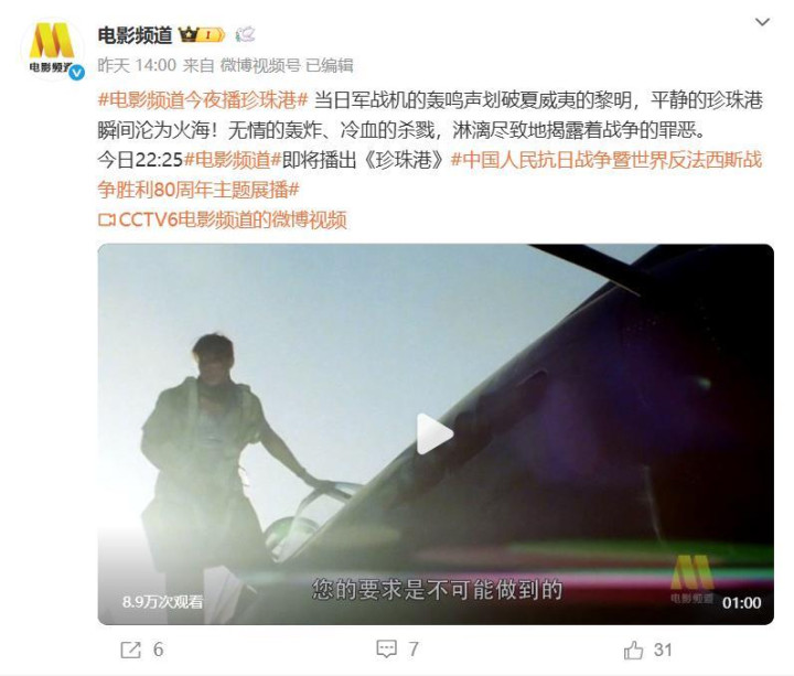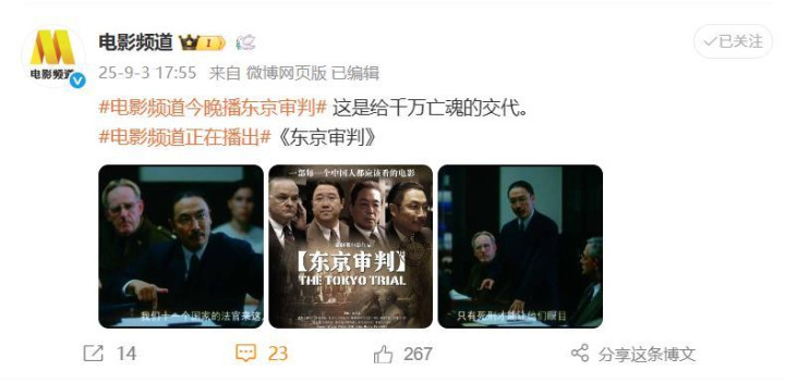 电影频道官方微博也发文对上述电影做了预告:“这段历史绝不能忘!电影频道今日17:55播出《东京审判》”“这是给千万亡魂的交代。电影频道正在播出《东京审判》”“当日军战机的轰鸣声划破夏威夷的黎明,平静的珍珠港瞬间沦为火海!无情的轰炸、冷血的杀戮,淋漓尽致地揭露着战争的罪恶。今日22:25电影频道即将播出《珍珠港》”。