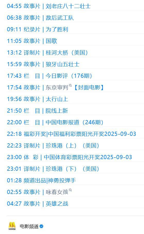 9月3日,纪念中国人民抗日战争暨世界反法西斯战争胜利80周年大会在北京天安门广场隆重举行。不少网友发现,9月3日当天,被大家亲切称为“六公主”的央视电影频道,播放了《东京审判》《珍珠港》《狼牙山五壮士》等影片。
